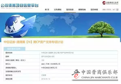 近日,上海证券交易所公司债券信息平台上显示,中信证券—滴滴第【N】期CP资产支持专项计划已于3月16日受理,此计划拟发行金额100亿,品种为资产支持证券-ABS。而此计划发行人为迪润(天津)科技有限公司,该公司唯一股东为滴滴出行科技有限公司。