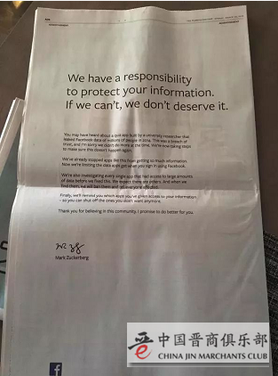 近日,扎克伯格在6份英国报纸和3份美国报纸上,采用道歉信形式为5000万Facebook用户信息被数据公司“剑桥分析”(Cambridge Analytica)泄露和利用一事道歉。页面占据报纸广告页整版,采用简单的白底黑字,附有扎克伯格的签名和Facebook的蓝色标志。