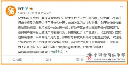 快手表示,注意到有媒体报道用户在快手平台上展示仿制视频,快手第一时间对报道中提及的账号进行了调查和处理。对于涉嫌传播教授制假的视频,发现一起处理一起,行为严重者将上报国家相关管理部门。