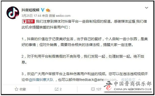 而抖音方面也对此作出回应。抖音个人对外销售,需要符合相关的法律法规。对于利用平台制假售假的不良账号,发现一起,处理封禁一起。绝不姑息。(腾讯科技)