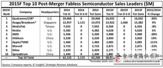 例如大家印象中很高端的芯片设计,下图是IC insight发布的2015年全球十大芯片设计公司,美国当然遥遥领先,前十名美国六家,中国2家,台湾和新加坡各一家。日本德国均未上榜。且海思和展讯营收增速排在前三位。