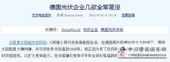 光伏产业的全球龙头是德国,一直到2008年,其全球市场份额还是世界第一,在中国企业的竞争下,德国光伏产业几乎全行业破产,博世和西门子卖掉或停止了太阳能业务。Solon、太阳能千年、Sovello、Conergy、Odersun等宣告破产。唯一幸存的大公司现在只有SolarWorld。该公司迫使债主放弃部分债务并赢得卡塔尔的大力投资,这才喘过气来。其它企业虽然还有残余或后续企业,但它们都不是独立企业。除了Solarworld外,德国太阳能工业几乎已经死亡。2013年底,德国太阳能产业只拥有4719个工作岗位。