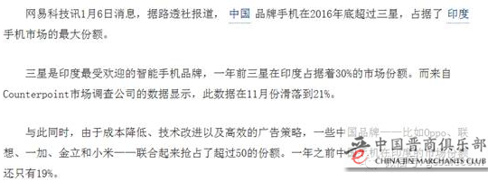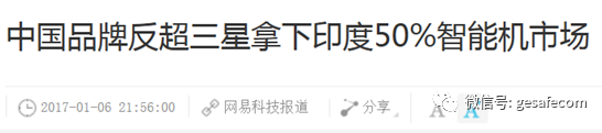 比如下面的这则新闻,在印度市场中国手机的崛起,2016年底占到了印度50%的市场份额,不只是韩国的份额被挤压,印度本土手机的份额也从40%下降到20%。