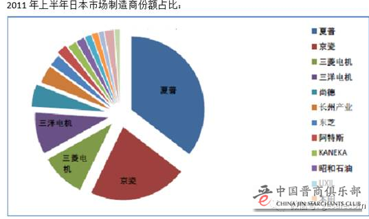 不只是德国,日本光伏组件本来是被京瓷,夏普,三菱等日本本土品牌占据的,2011年,日本本土品牌还占据了日本90%的光伏市场。