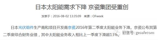 而日本光伏的前两名,夏普太阳能,在2016年3月结束的财政年度,亏损184亿日元,亏损超过10亿人民币。而日本京瓷太阳能2016年第二季度收入比上一季度下降13%。
