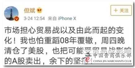 但斌3月24日发布微博解析全球股市大跌时表示,市场担心贸易战以及由此引起的变化!我也怕重蹈08年覆辙,周四晚上清仓了美股,也把可能受到贸易战的影响的A股卖出,余下的坚持。