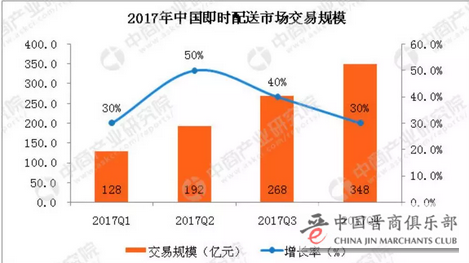 据中商产业研究院发布的《2018-2023年中国即时配送行业市场前景及投资机会研究报告》数据显示,2017年第四季度中国即时配送市场交易规模达到348亿元,增长率为30%。预计2018年中国即时配送市场交易规模将继续增长。