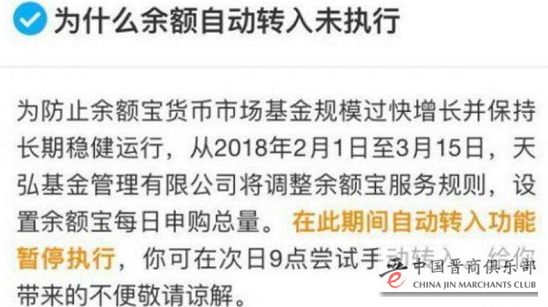 春节前夕(1.31),支付宝突然发布《余额自动转入余额宝暂停公告》,宣布暂停余额自动转入余额宝的功能,并调整余额宝服务规则,从2018年2月1日至3月15日,设置余额宝每日申购总量,每天早上9点发售,余额宝只放出2万元的额度。