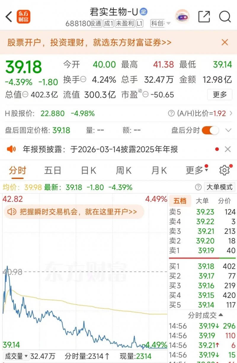 君实生物A股今日下跌4.39%,收报39.18元/股。