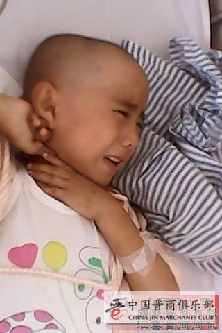 白血病,花钱就象吞钱,是夺取生命的魔鬼。第一个疗程经历了所谓的化疗带来的副作用,一头乌黑的头发三天就掉光了,身体内脏都受到损伤,所谓的以毒攻毒,杀死白细胞的同时也杀死了正常的细胞,也损伤了五脏六腑。上化疗半个月,由于副作用太大,肚子开始疼,疼的撕心裂肺,疼的咬牙切齿,大小便失禁,突然昏迷,经过一个小时的抢救,终于从死亡线上拉回来,从抢救室出来时身上竟然有六根管,即两根输液管,一根输血管,吸氧管,导尿管,肛门排气管,六管其下,这样的场面,又有几人能承受的了。终于第一个疗程完了,肚子也不是很疼了,可是新的病状发生了,喉咙开始疼,疼的哭不出声,哭到没有了眼泪,有一次孩子哭完还开玩笑说“爸爸,看我没有哭吧,我都没有眼泪,有眼泪才是真的哭呢,是吧”。我听了,哭了(孩子生病以来第一次流泪)。由于病情比较严重,第一个疗程就花了十万元,而这些都是亲戚朋友的血汗钱。