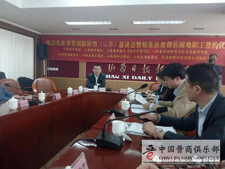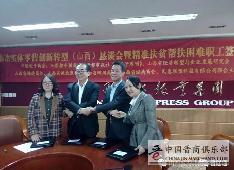 日前,推动实体零售创新转型(山西)恳谈会暨精准扶贫帮扶困难职工签约仪式在太原举行,来自中国电子商会、山西省福建商会、山西省湖北商会、山西省湖南商会、山西省四川商会、山西省广东商会、山西省江苏商会、民惠联盟等商会组织的近百人参会(广东商会、福建商会、湖南商会均是中国晋商俱乐部联合发起机构),会上大家热烈交谈,强强联手,为山西省实体经济转型,精准扶贫,合力拉动本省消费建言献策。