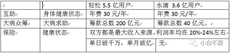按照咱们水滴筹老大沈鹏朋友圈里的意思,水滴互助目前订单量是轻松互助的3倍,水滴筹的日订单量占两家筹款平台订单量总和的55%。那么恕我粗浅的文科水平来计算,3.6亿里的水滴保的数量肯定应该比轻松e保的少吧——因为生了病的水滴筹、轻松筹用户是无法成为保险用户的,保险公司嘛,大家都懂的,你转氨酶高都不会给你承保,更何况你都因病众筹去了。