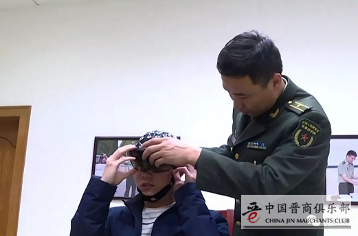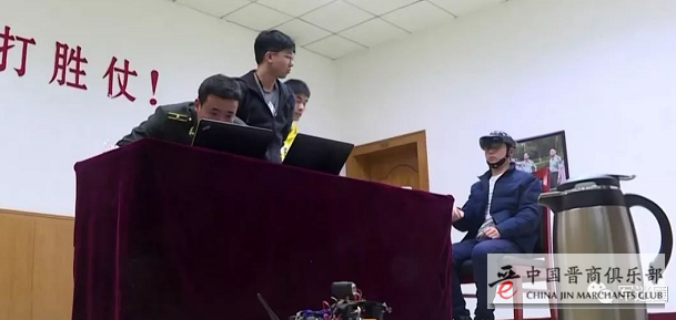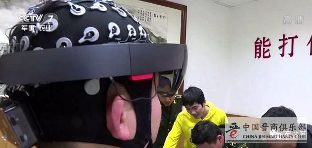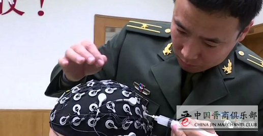解放军国防科技大学的研究人员对脑控头盔进行认真的调试工作。