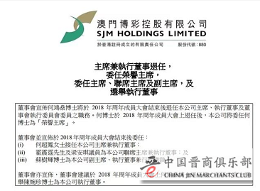 4月12日晚,澳门博彩控股董事会宣布, 何鸿燊将于2018年6月12日退出公司董事长和执行局成员年度会议,宣布赌博王将被任命为公司荣誉主席。