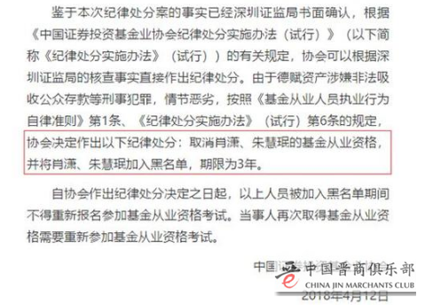 德赋资产两名高管同样被协会拉黑。法定代表人肖潇、合规风控负责人朱慧珉的基金从业资格被取消,并将二人加入黑名单,期限为3年。