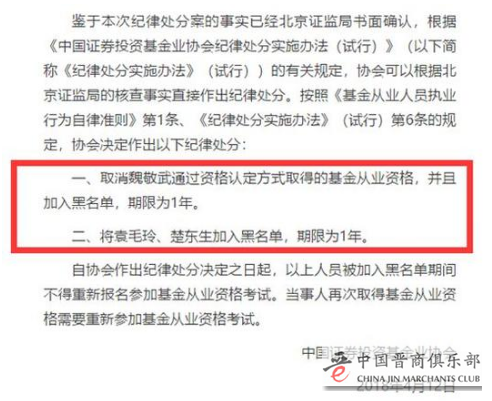 按照协会公告,取消公司总经理魏敬武的基金从业资格,并加入黑名单,期限为1年。实际控制人袁毛玲、法定代表人楚东生也被加入黑名单,期限为1年。之所以没有取消基金从业资格,是因为这两位高管并没有基金从业资格……