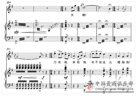 “刀杀我斧砍我,你不该这样糟蹋我”这句是“曲首冠音”。音乐采用戏曲垛板。演唱者必须具备戏曲基本功,把几个字,特别是“糟蹋我”三个字,用“喷口”喷出来,如此才能感染观众。我童年时演唱过山东梆子、河南豫剧,这些基本功派上了用场。采用演唱梆子的方法,把字咬住,用气息推出,效果极佳,很有感染力。