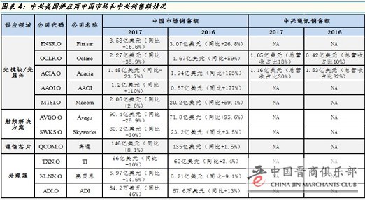 从中兴通讯北美供应商情况来看,2017 年 Oclaro 中兴采购占 18%营收(1.05 亿美元),Acacia 中兴采购占 30%营收(1.16 亿美元),同时大部分北美光通信、射频器件、处理器厂商在中国地区的营收增速超过 30%。如果禁运实行,对中美两国将是两败俱伤。