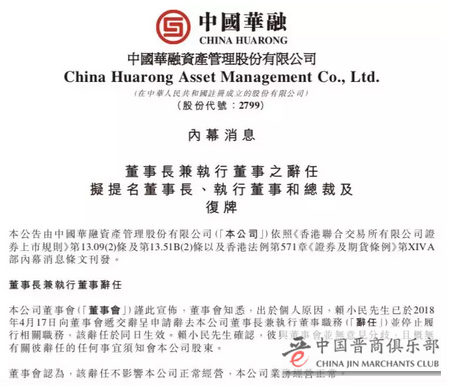 4月20日早间,中国华融(02799.HK)发布公告称,出于个人原因,赖小民先生已4月17日向董事会递交辞呈申请辞去本公司董事长兼执行董事职务并停止履行相关职务,该辞任于同日生效。