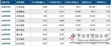 今日有9只股票价格盘中突破了牛熊分界线(250日线),长线或走强。其中乖离率较大的个股有汇顶科技、亚翔集成等,乖离率分别为7.72%、7.32%;亚太科技、北方股份等个股乖离率小,刚刚站上牛熊分界线。