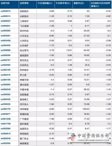 今日盘中有209只A股短期均线出现“死叉”,5日线主动下穿10日线,短线走势或不乐观。其中创新股份、永新股份、江南高纤等个股的5日均线较10日均线距离最大,分别达-5.32%、-3.62%、-3.5%。