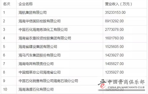 海南企业联合会和海南企业家联合会以2016年企业营业收入为入围标准,排序出2017海南省企业100强名单。其中前十位的是: