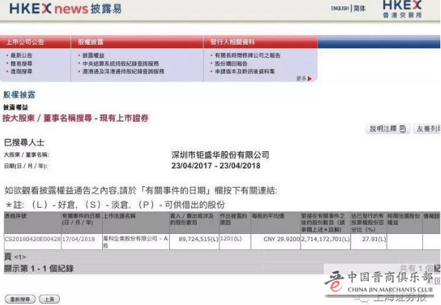 4月23日,港交所披露文件显示,钜盛华在4月17日减持了8972万股万科A股,减持均价29.92元/股。套现近27亿元。