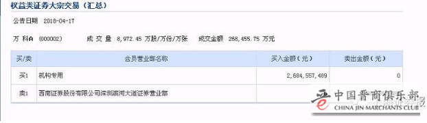 4月17日,万科A大宗交易成交8972.45万股,成交金额26.85亿元,卖出方为西南证券股份有限公司深圳滨河大道证券营业部,买入方为机构专用席位。