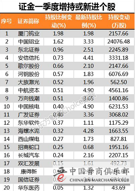 另外的20家证金增持的上市公司中,中国铝业是唯一一只持股变动大于1%的公司,达到1.62%。