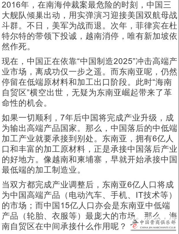 为啥?自贸区,你进口原材料不交税吧,搞加工制造业的风水宝地啊。然后海南地方够大吧,修厂建流水线的底盘多的是。最后海南又是自由港吧,货物出口也是免税,从进口到出口海南搞一条龙服务,哪还有新加坡的事儿?