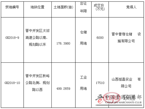 宗地编号GK2018-9地块位于晋中开发区太旧高速公路以南、规划路以东的仓储用地,由晋中普宿仓储设施有限公司以6000万元获得,其土地出让面积176.3980亩。