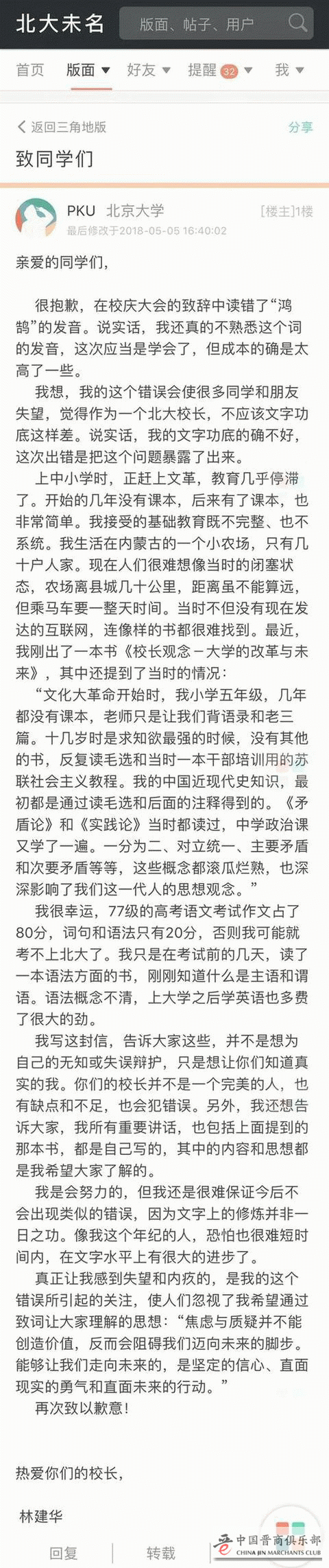 网友一开始对读错字嘲笑北大林校长,而道歉信出来之后,这位林校长却将问题一下子扯的好远。