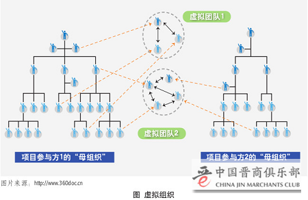 ►虚拟组织。虚拟组织也称为网络结构,它是完全建立在网络思维和技术的基础之上的。虚拟组织指两个以上的独立实体,为迅速向市场提供产品和服务,在一定时间内结成的动态联盟。它不具有法人资格,也没有固定的组织层次和内部命令系统,是一种开放的组织结构。它可以在拥有充分信息的条件下,从众多的组织中通过竞争招标或自由选择等方式精选出合作伙伴,迅速形成各专业领域中的独特优势,实现对外部资源的整合利用,从而以强大的结构成本优势和机动性,完成单个企业难以承担的市场功能。