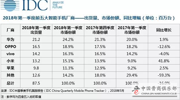 据中国信息通信研究院发布的数据显示,2018年1—3月,中国智能手机出货量同比下滑27%,而事实上这已经是国内智能手机市场出货量连续12个月的下跌了。IDC公布的数据同样显示,2018年第一季度,中国智能手机市场出货量同比下降约为16%,前五之外的智能手机厂商销量更是跌幅更是高达59.3%,并且中国市场的疲软表现也拖累全球智能手机销量在2018年一季度同比下滑2.4%。