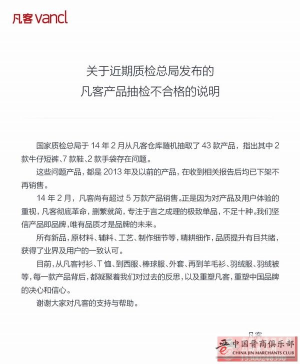 关于近期质检总局发布的凡客产品抽检不合格的说明