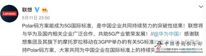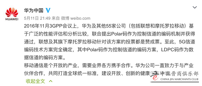 5月11日21:49,华为通过其官方微博“华为中国”发布声明称,2016年11月3GPP会议上,华为及其他55家公司(包括联想和摩托罗拉移动)基于广泛的性能评估和分析比较,联合提出Polar码作为控制信道的编码机制并获得通过,联想及其旗下摩托罗拉移动针对该方案的投票都是赞成票。