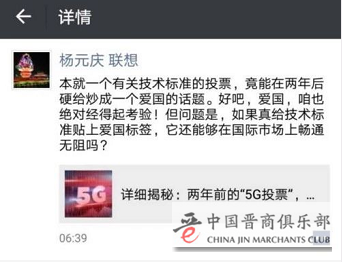 5月12日上午,联想集团董事长兼CEO杨元庆在其朋友圈转发了题为《详细揭秘:两年前的“5G投票”,联想究竟做了什么?》的文章,并配文:“本就一个关于技术标准的投票,竟能在两年后硬给炒成一个爱国的话题。好吧,爱国,咱也绝对经得起考验!但问题是,如果真给技术标准贴上爱国标签,它还能够在国际市场上畅通无阻吗?”