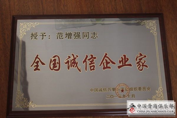 范增强被”全国诚信万里行组委会“授予”全国诚信企业家“荣誉称号