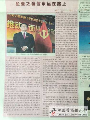 2018年5月4日,中国都市报第二版以“企业之诚信永远在路上”为题,对河南省晋商会(中国晋商俱乐部