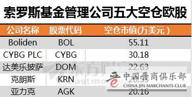 在这些未公开披露的做空仓位中,索罗斯基金的五大欧洲空仓个股分别是:瑞典矿商Boliden、英国银行Clydesdale、Yorkshire母公司CYBG、伦敦上市的达美乐披萨、德国罐装及包装设备制造商克朗斯(Krones)以及英国电力设备供应商亚力克(Aggreko)。