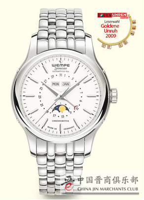 WEMPE Zeitmeister的月相显示占据主表盘的显著位置,可准确运行122.6年。月相盘的专利涂层,为这个天文复杂装置带来栩栩如生的造型,引人注目。月相显示可重现两个新月之间的时间,精确率达99.9978%。平均朔望月的长度为29天12小时44分3秒。为简化起见,典型的月相显示大多将这个周期缩减至29.5天,使每个朔望月产生44分3秒的偏差,而在短短两年半内,便会形成一整天的误差。幸而该款表的135齿轮装置具备更精确的计算能力,使每个周期的偏差少于一分钟。倘若设定正确且腕表一直运行,月相显示在122.6年后才需调校一天。