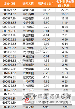 6月4日影视动漫行业个股表现情况:
