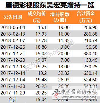 去年12月8日,唐德影视发布公告称,吴宏亮计划从 2017 年 12 月 11 日起的12个月内,增持本公司股份,增持金额不低于 3000 万元,增持比例不超过本公司已发行股份的2%。 当时,吴宏亮直接持有公司149,167,640股,占公司总股本的 37.29%。