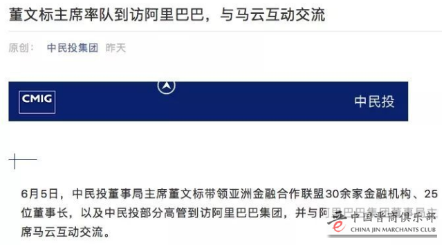 6月5日,中民投官方微信发布了一则看似不起眼的消息,标题是《董文标主席率队到访阿里巴巴,与马云互动交流》。