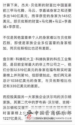 其他富豪与之相比的差距就更大,例如有着硅谷钢铁侠之称的马斯克身家还不到贝佐斯的七分之一。与中国富豪相比,贝佐斯的身家则比财富位列前三位的马化腾、马云、李嘉诚之和还要多一点。