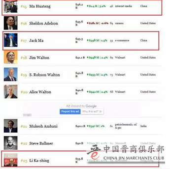 就中国富豪而言,腾讯CEO马化腾身家为462亿美元,位于全球富豪榜第15位;阿里巴巴董事局主席马云为433亿美元,排在全球第17位。除这2位跻身前20的中国富豪外,李嘉诚凭借338亿美元的财富成为中国排名第三的富豪,位列全球第23位。