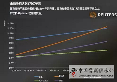 做个假设,如果苹果股价以过去一年的速度维持上升,则到9月时该公司市值将触及1万亿美元。亚马逊股价若保持与过去一年相同的增速,则其市值将在10月达到1万亿美元,并在这之后很快超过苹果。