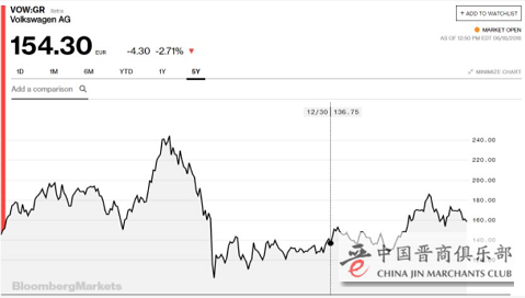大众现在的股价自2015年9月丑闻曝光后有了较大幅度的回升,但比起其2015年4月的股价高点依然下降约44%。