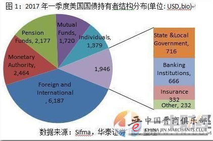 根据Sifma网站公布的2017年一季度末美国国债持有者结构的分布,15.87万亿美元存量国债中,持有份额最多的仍然是外国投资者,规模为6.1万亿美元、占比39%。