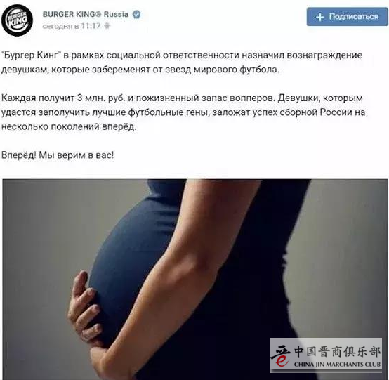 广告大意为:“如果你为一名世界杯球员怀上了孩子,将得到300万卢布(约合4.7万美元)奖励,还能终身免费享用大汉堡”,同时,汉堡王还做了补充说明:“获得最佳足球基因的女性将在未来几代人中帮助俄罗斯队取得成功。”
